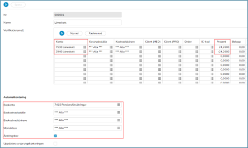 Verifikationsmallar skapas i Ekonomi | Backoffice | Basregister, fliken Bokföring.