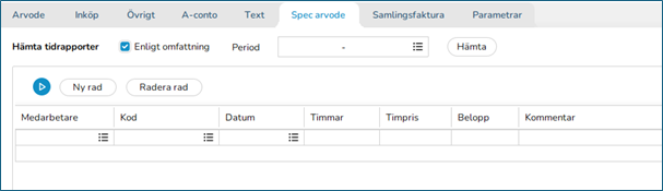 Under fliken Spec arvode skapas en fakturaspecifikation för arvodet med kommentarer från tidrapporten som automatiskt skickas med fakturan i samma Pdf. Funktionen slås på i projektredovisningens parametrar fliken Fakturering och fakturamallen behöver vara anpassad. Då visas en ny flik Spec arvode inne på fakturan.