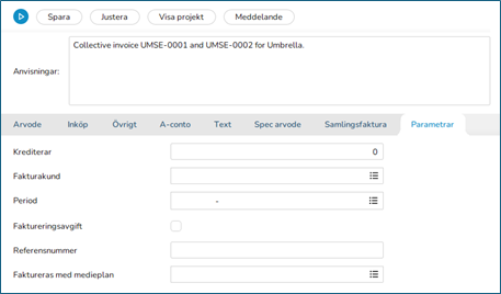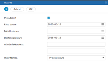 | Faktureringsavgift | Om en övrigtkod för faktureringsavgift finns inställt i projektparametrarna och på projektet kryssas faktureringsavgift i om det ska gälla fakturan |