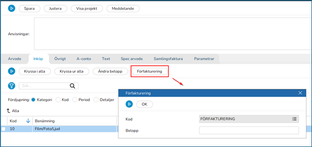 Förfakturering är enbart synlig och kan användas om det är inställt i parametrarna. Förfakturering görs vanligtvis för att fakturera inköp som det inte har inkommit leverantörsfaktura på.