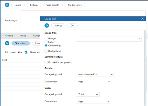 | Skapa text | Med knappen Skapa text kan en färdig text och belopp från projektbudgeten användas, belopp från omfattningen eller belopp som är upparbetade och ligger i lager hämtas. |