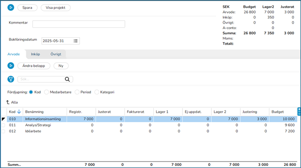 - Efter justeringen är gjord har projektet en minuspost som kan faktureras.