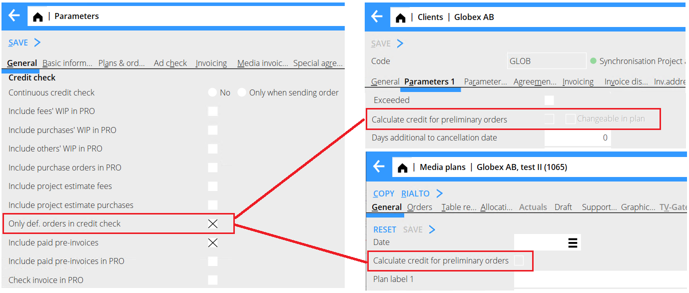 If the Media parameter "Only def.orders in credit check" is set the corresponding parameter "Calculate credit for preliminary orders" on the Client and on the Media plan is disabled.