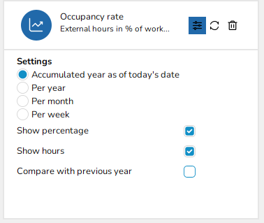 Accumalated year as of today's date, Per year, Show percentage, Show hours and Compare with previous year.