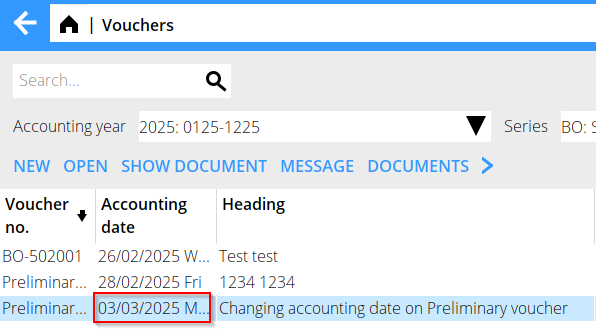 A new feature has been added making it possible to change the accounting date of a preliminary voucher.