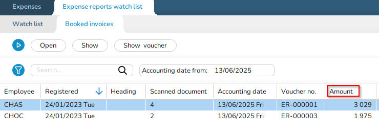 A new column for Amount has been added in Accounting|Expenses|Expense reports watch list|Booked invoices