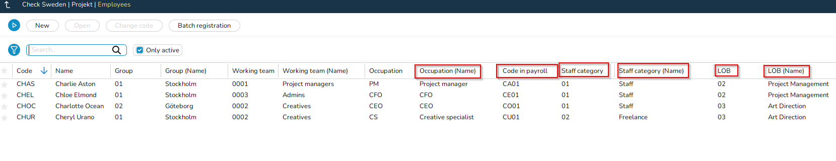The new columns are: Occupation (Name), Code in payroll, Staff category, Staff category (Name), LOB and LOB (Name)