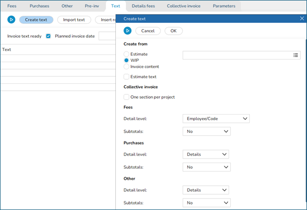 | Create text | Create text to use existing WIP in the project or to invoice from the estimate. |