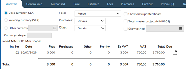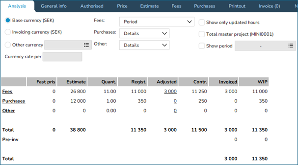 | Show period | The Analysis tab normally displays the current status of the project, but by selecting Show period and specifying a period, the information will only apply to that period. Please note that Invoiced shows what has been invoiced from what has been registered during the selected period. |