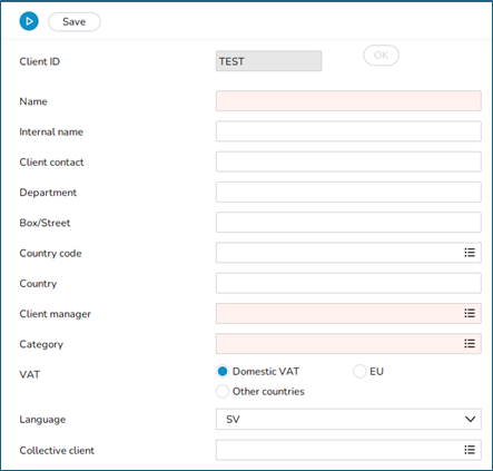 New clients and projects are registered in the client – and project lists. The function for registration must be activated and the user must be authorised to it. New client Press the NEW button in the client list. Enter Client ID and press OK. Then fill in the rest of the fields and Save. There are settings that must be made for registration of clients here and not in Backoffice. The fields are determined in the project parameters.