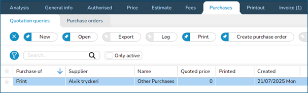 In the Purchasing tab, you will find Quotation queries on the left. Queries can be sent to suppliers, after which a purchase order can be created based on the quotation. Purchase orders are created either from the quotation or under the Purchase order tab. The purchase order can then be used when approving supplier invoices to match the purchase against the purchase order.