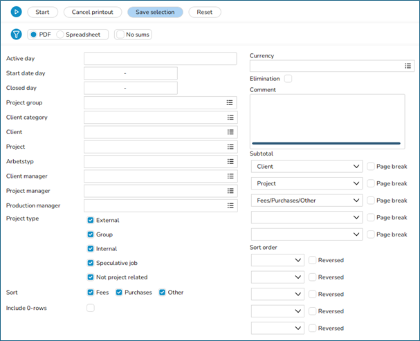 | Language | You can select languages, provided that the cost codes have been translated if they are included in the printout. |