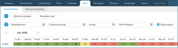 In the Fees tab, the Reconciliation tab to the left shows the times that employees have registered either for the project or in total. Yellow days are not ready, green days are fully reported and red days are incomplete. If the Only project box is checked, hours marked in bold appear on the days that contain time reports for the project.