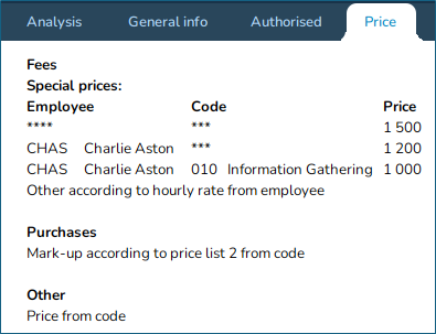 If there is a fixed price for the project, it will be shown at the top of the respective area. Any hourly rates that differ from the employees' regular hourly rates will then be shown. The special hourly rates cannot be changed in this view; they can only be entered by an administrator. The following order of priority is used for special hourly rates ****/*** means all employees and all job codes. The example in the image above shows that all employees cost 1500 SEK on all codes, except Charlie, who normally costs 1200 SEK, but when working with job code Information gathering, he costs 1000 SEK. If the parameter setting Price per job code is activated instead of Price per employee, the special rates will not be taken into consideration. It will only say that hourly price is fetched from code For purchases, there are fixed markups per code that are used to calculate the price for the clients. For other records, the unit prices are retrieved from the respective other code.