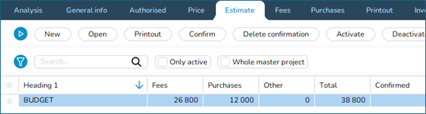 | Estimate records | Shows the information in the tabs Fees, Purchases and Other |