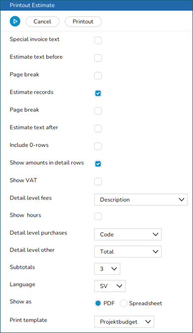 | Page break | Tick if there should be a cover page with information about the project before the estimated values for fees, purchases and other are presented. |