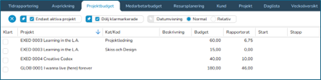 Projektbudget visar alla poster där medarbetaren budgeterats. Varje kombination av projekt och arbetskod framgår som en egen rad i listan tillsammans med en eventuell beskrivning. Därefter framgår hur många timmar som har blivit budgeterade samt hur många timmar som registrerats. Beroende på hur noggrant budgeten har formulerats visas start- och slutdatum. I tabellen finns det även ruta per rad för att klarmarkera, och en selektering som visar/döljer klarmarkerade poster.