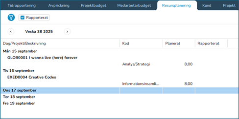 Här finns möjlighet att jämföra den planerade tiden på projekt med den rapporterade, vecka för vecka.